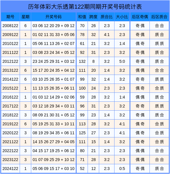 后区奖号分析:去年同时开出奖号为03、10,在积年同时开奖中,后区号码大小比为17:17,质合比为16:18,本期预测后区开出【小大+合合】组合的奖号,参考:04,08。